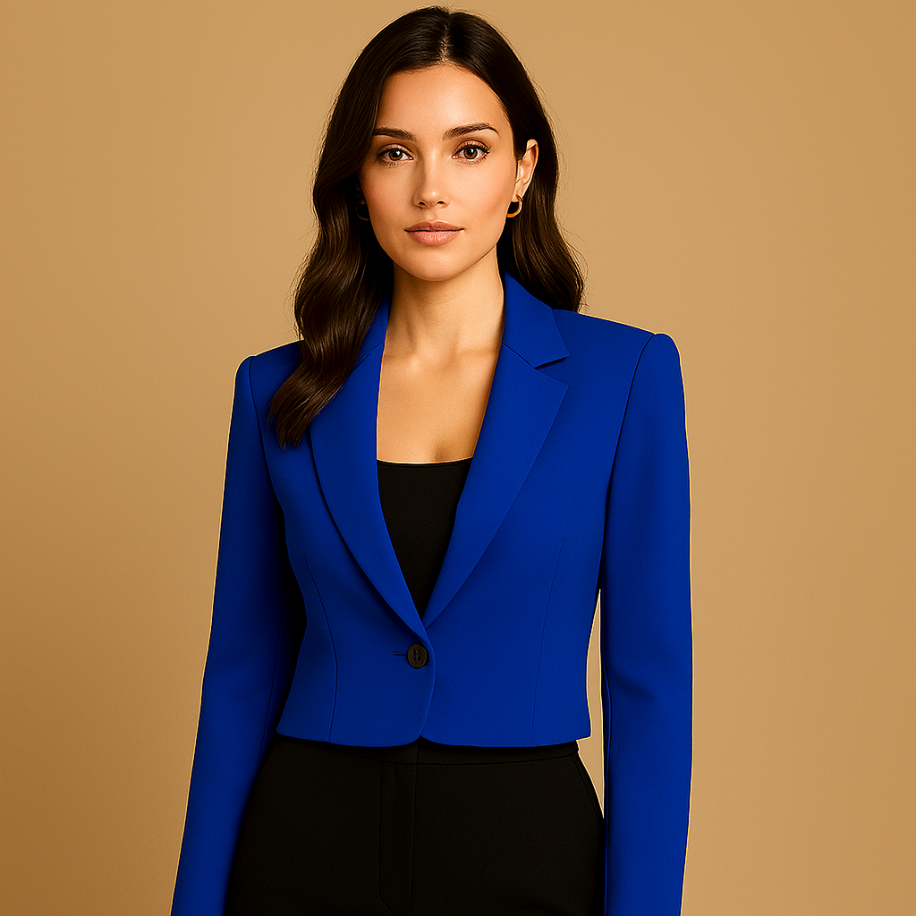 Elevate your layering game with this cropped blazer jacket in a striking sapphire blue. Designed with sharp padded shoulders and a sleek single-button closure, it offers just the right amount of structure to flatter your silhouette. The tailored fit and bold hue make it perfect for both power dressing and chic evening edits. Style it with high-waisted trousers or over a fitted dress for an effortlessly confident look.